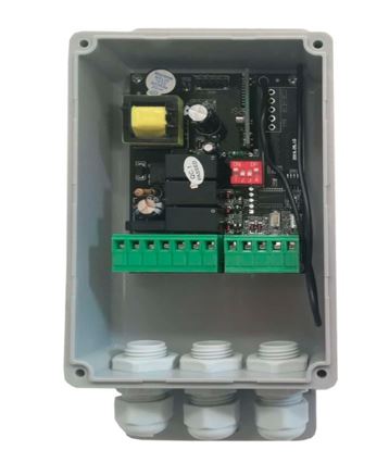 Central de controlo monofásica de 100 a 250V AC para estore/grades de enrolar, com recetor multimarca (Rx Multi-marca) integrado para a frequência 433 MHz.