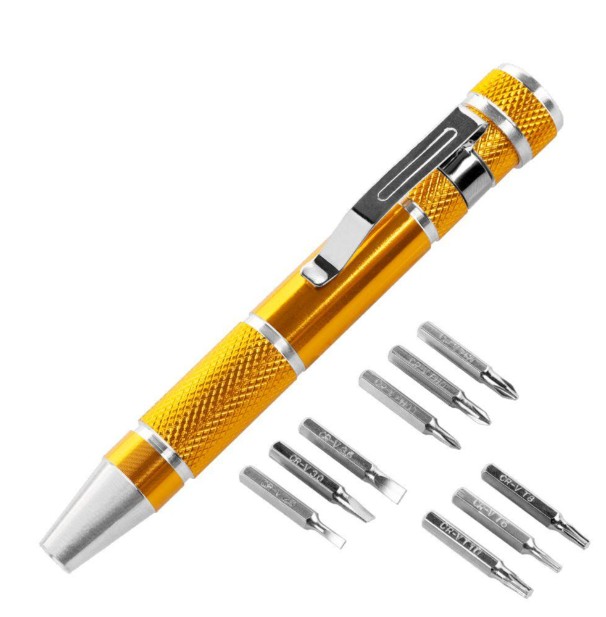 Conjunto de ferramenta tipo caneta dourada com 8 pontas metálicas distintas