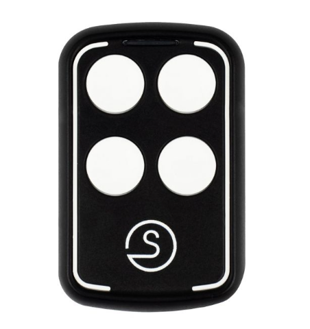 Controle remoto preto com quatro botões redondos brancos e símbolo branco