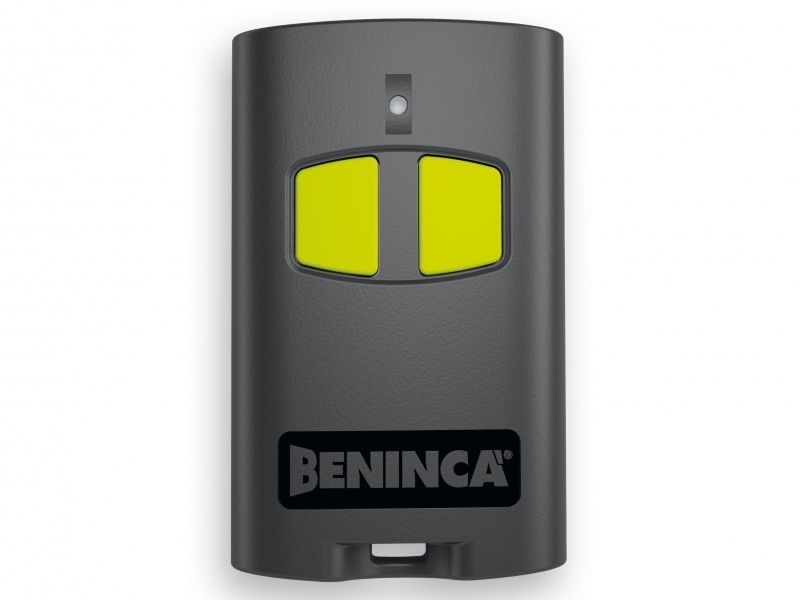 Comando remoto cinzento e amarelo com duas teclas e marca BENINCA
