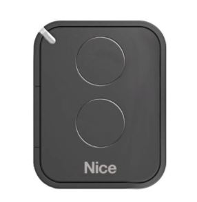Comando remoto preto com dois botões circulares e texto Nice