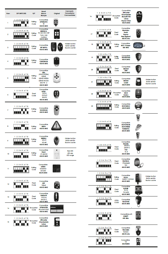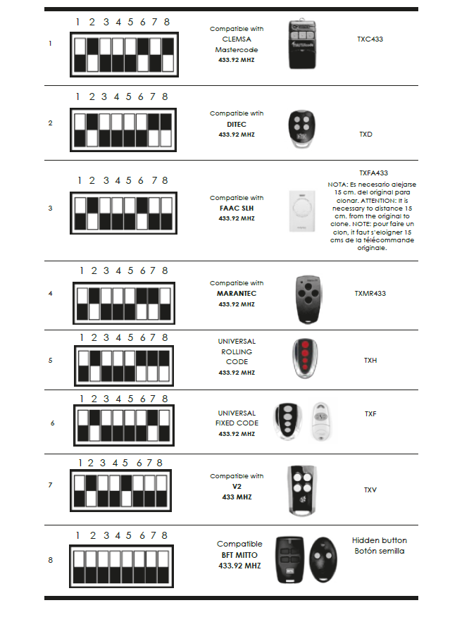 ALLMATIC; AUTOMATEASY; APRIMATIC; BENINCA; BERNER; BFT; CAME; CARDIN; CLEMSA: CRAWFORD NORMSTALL; DEA: DITEC; DOORHAN; DUCATI; EINHELL; ERONE; ERREKA; FAAC; GENIE; GIBIDI; HÖRMANN: JCM: KEY; KING GATES; LIFTMASTER; MARANTEC; AUTOMATEASY; MOTORLINE; MOTORLIFT; NICE; NORTON; NOVOFERM; PRASTEL; PROTECO; PUJOL; ROGER; ROLLTORE: SKYMASTER; SOMFY; STAGNOLI; TELCOMA; TANGO; TELECO; V2.