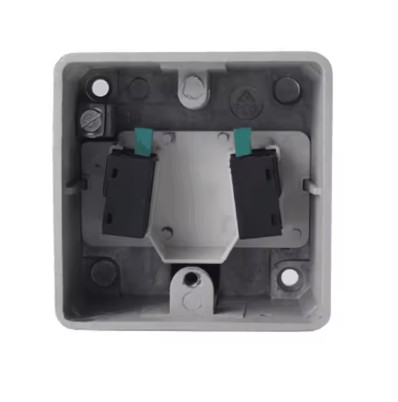 Caixa elétrica quadrada cinza com interruptores pretos e detalhes azul-esverdeado.