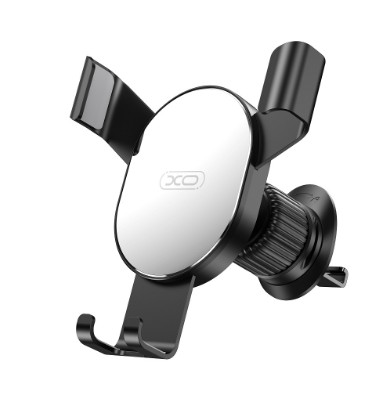 Suporte para telemóvel de carro preto com centro cromado e texto XO