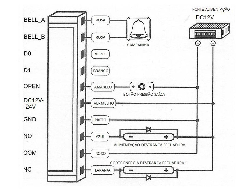 Ligações Disponíveis: Fechadura Elétrica, Botão de pressão de Saída, Campainha
